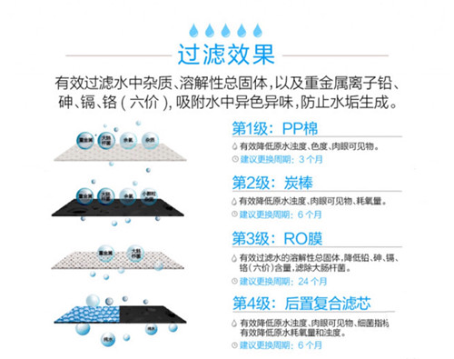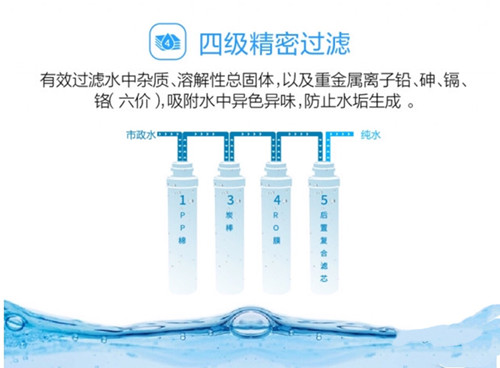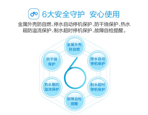 6大安全守护,安心使用; ETC模块化滤芯设计,单手即可轻松更换,方便快捷; 四级过滤系统,反渗透技术,出水更纯净; 步进式加热技术,逐步补水加热,出水更快、更省电。