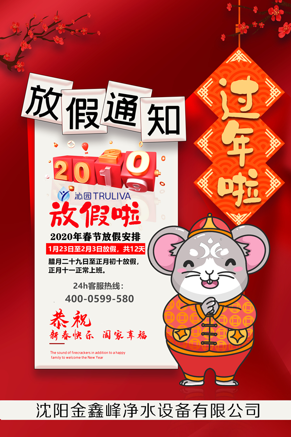 春节期间净水设备的管理 * 春节期间若无人照管,人员离开前请务必先切断水源和电源,关掉进水球阀,再将整机、压力桶和滤瓶里的水排出。 * 春节假期后返工时,在重新启用净饮水设备前,请先检查机器外观是否正常,确认后接通水源电源,放水冲洗后再进行使用。