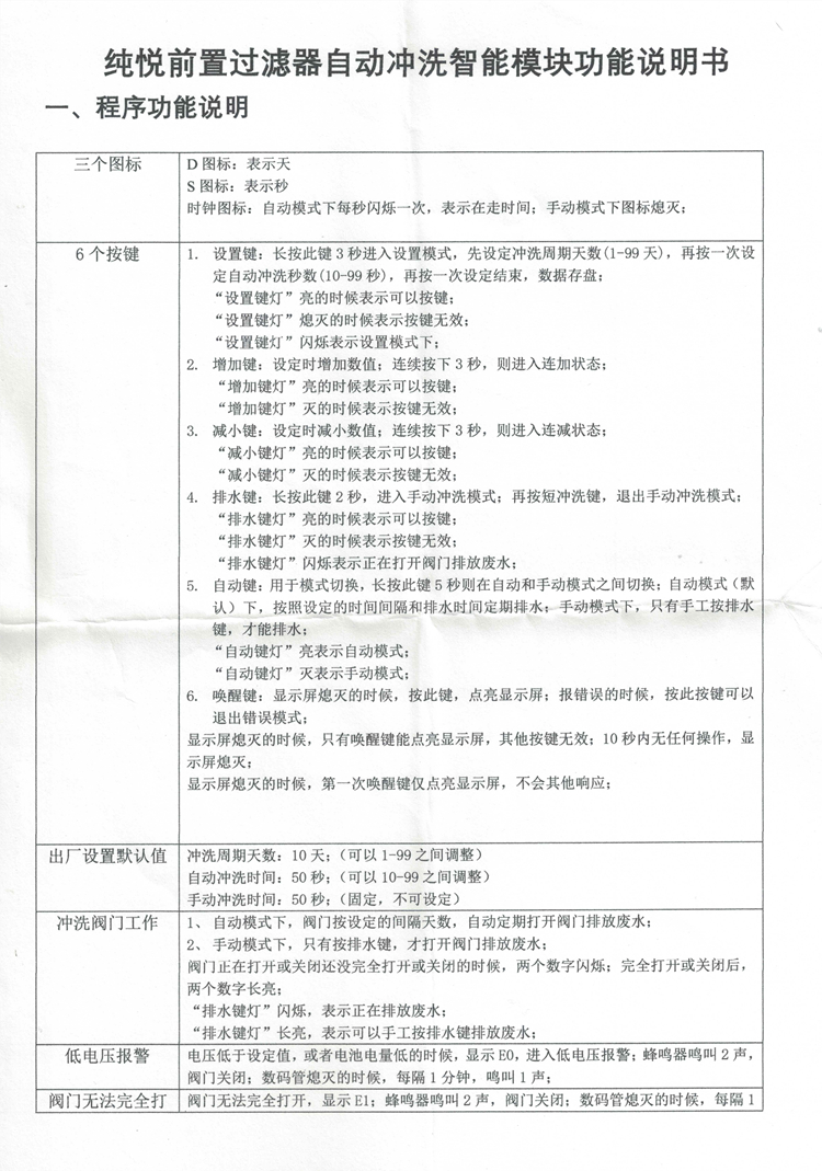 纯悦前置过滤器电子冲洗阀说明书